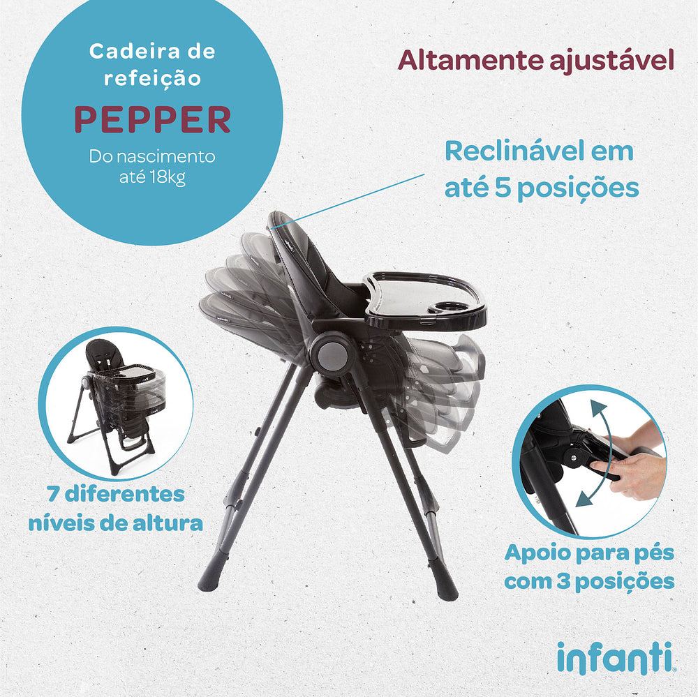 Para os momentos de descanso do bebê ou a hora da papinha, a cadeira de refeição Pepper da Infanti vem colocar um tempero de conforto e praticidade na vida dos pais. Extremamente confortável, sua capa acolchoada é impermeável, para que os pais possam deixar tranquilamente o bebê, neste momento de aprendizado importante, explorar novos alimentos, os talheres ou copinhos.
