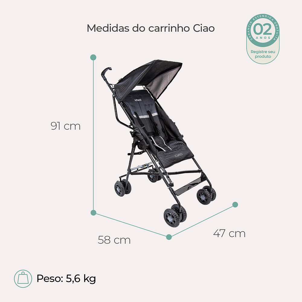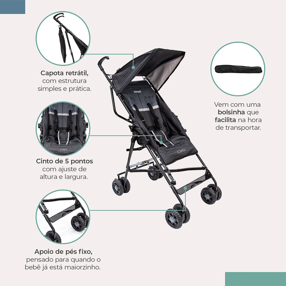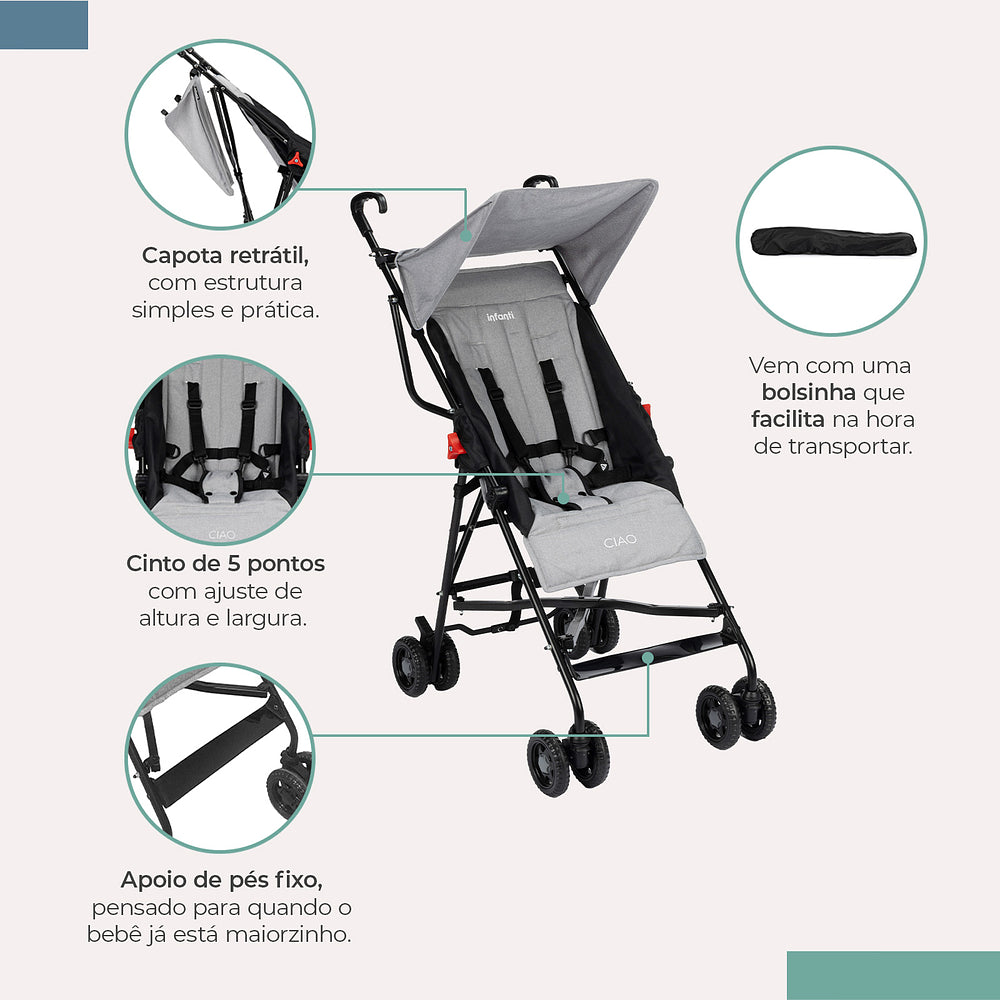 Com apenas 5,25 kg, o Ciao tem fechamento guarda-chuva e vem com uma bolsa plástica que facilita o transporte. As rodas duplas garantem estabilidade, o freio interligado nas traseiras dá segurança, e as manoplas ergonômicas acompanham os movimentos.