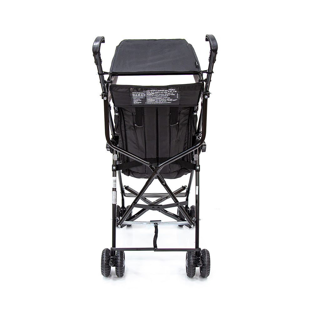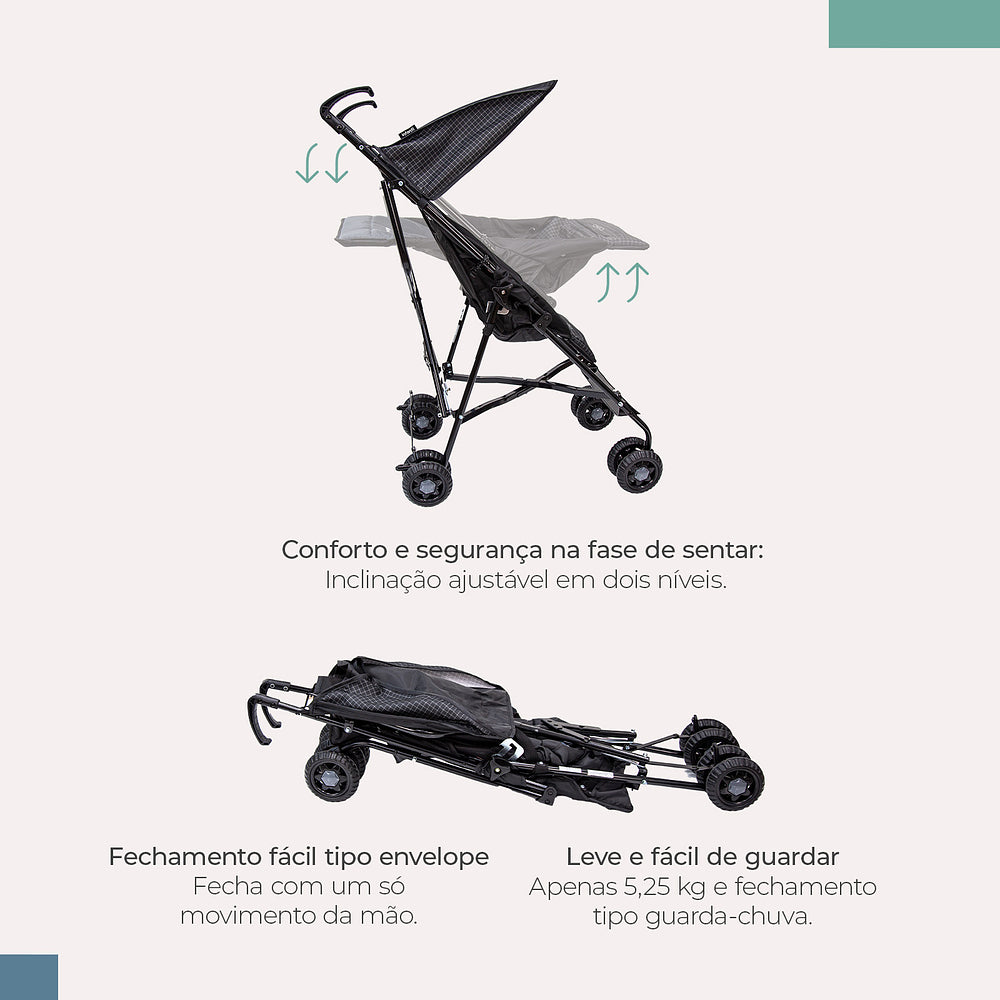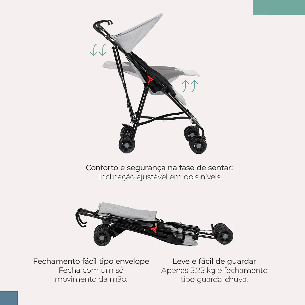 O assento tem duas posições de inclinação, o apoio de pés é fixo, e a capota retrátil pode ser usada quando o sol aparecer e recolhida quando não for mais necessária. O cinto de cinco pontos, com ajustes de altura e largura, protege com conforto e se adapta ao crescimento.