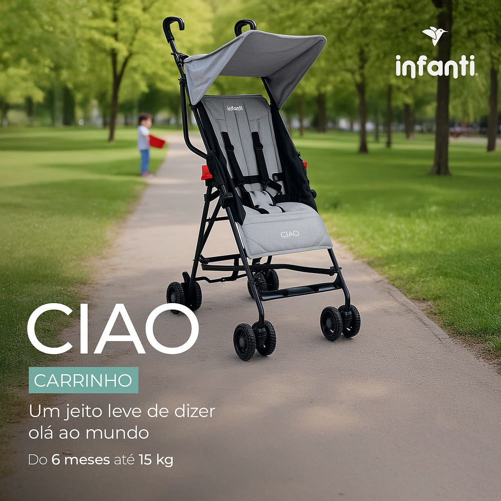 Aos poucos, o bebê começa a observar o mundo de outro ângulo, e o Ciao nasceu para esse momento. Ele é um carrinho leve, prático e acolhedor, que ressignifica o momento de sair de casa, entregando conforto em casa passeio.