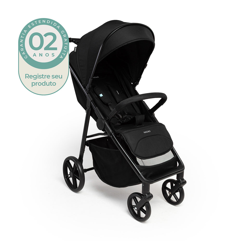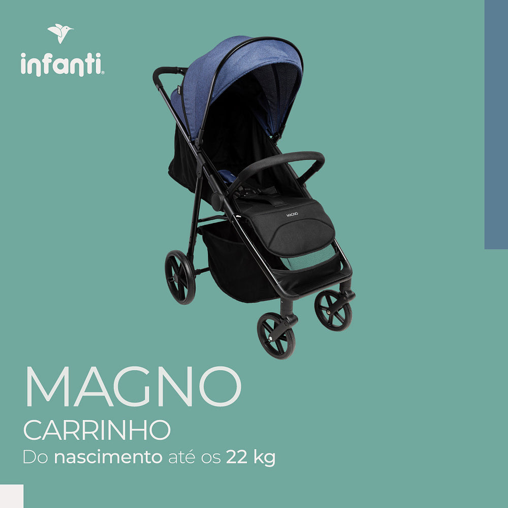 O Magno foi pensado para acompanhar o seu bebê desde o nascimento até os 22 kg, oferecendo conforto e estabilidade em cada passeio. Suas rodas grandes, com 25 cm de diâmetro, têm amortecedores nas quatro pontas, o que ajuda a manter o carrinho firme e suave mesmo em terrenos irregulares.
