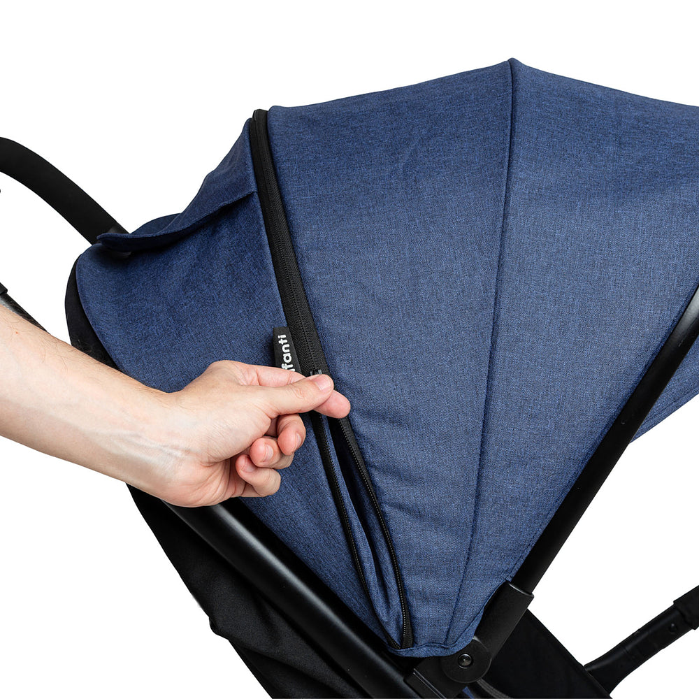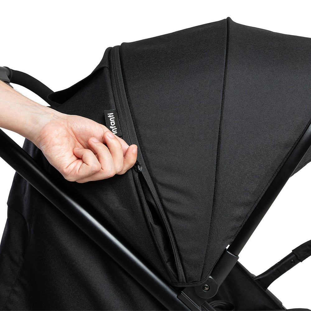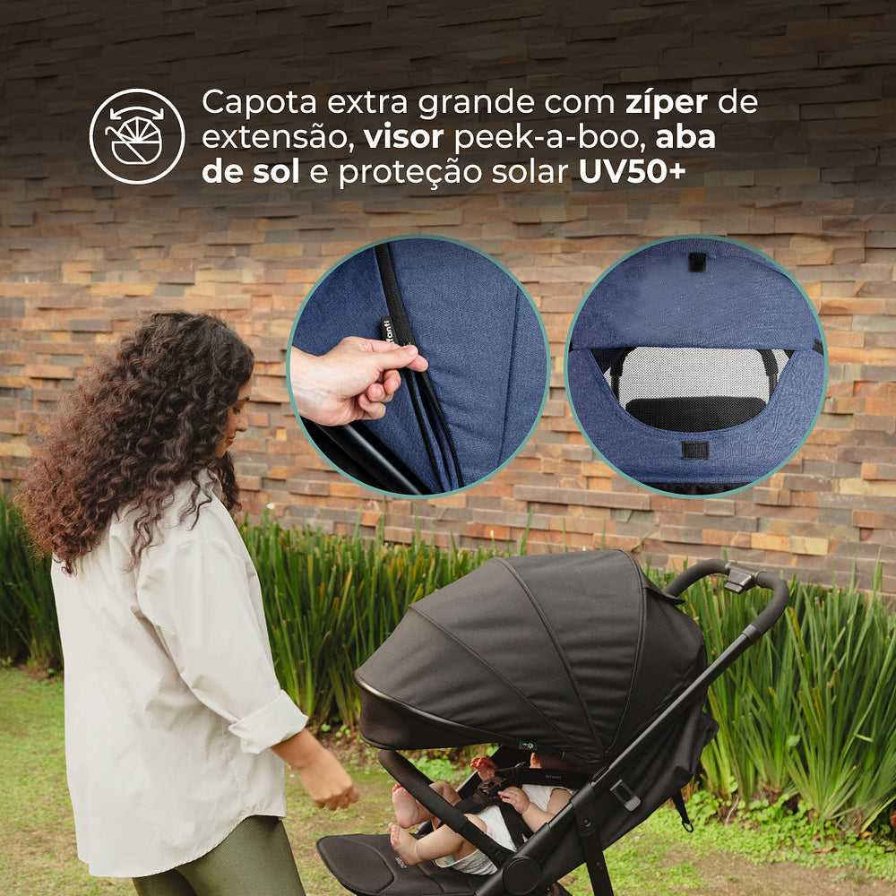 A capota é extra-grande e conta com zíper de extensão, que permite ampliar ainda mais a cobertura do assento. Traz visor peek-a-boo para que você acompanhe o bebê durante o passeio, e capota com fator de proteção UV50+.
