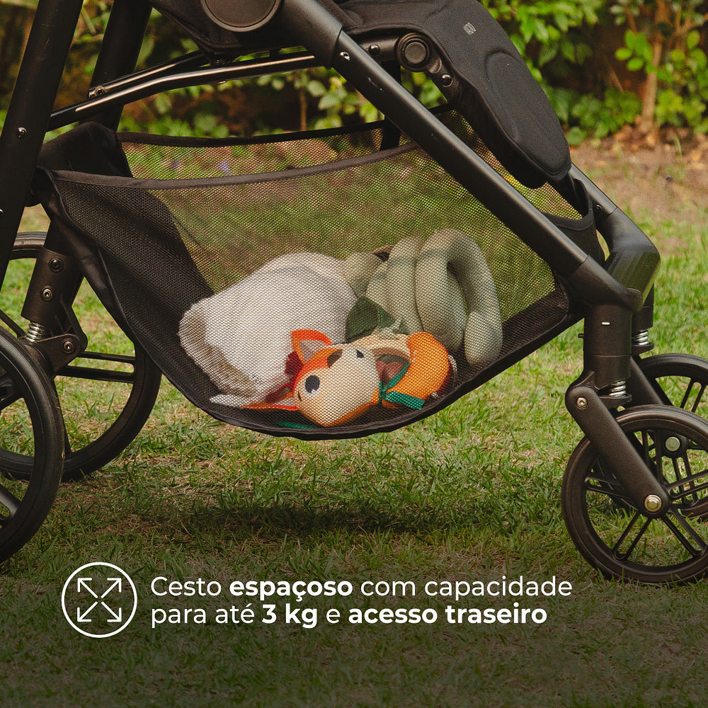 O cesto tamanho família comporta até 3 kg e tem acesso pela parte traseira, guardando com facilidade tudo o que o passeio pede. E quando chegar a hora de fechar o Magno é fácil: basta uma mão, porque quem cuida o tempo todo merece soluções que acompanhem o seu ritmo.