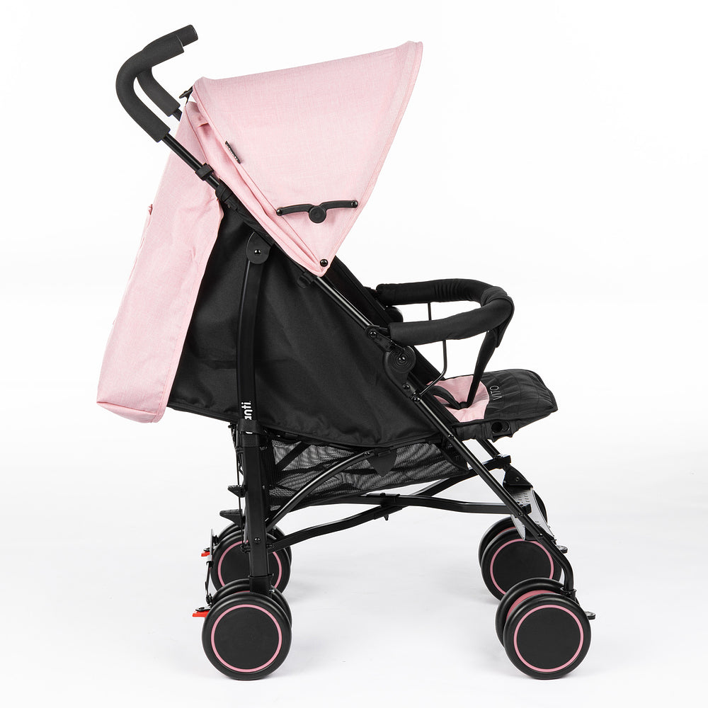 A capota é ampla, com extensor e visor, ajudando a proteger do sol e do vento durante os passeios. O apoio para os pezinhos ajusta conforme o bebê cresce, e a barra frontal tem proteção entrepernas para deixar tudo mais seguro e confortável.