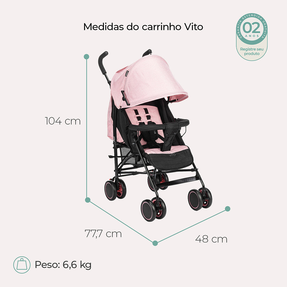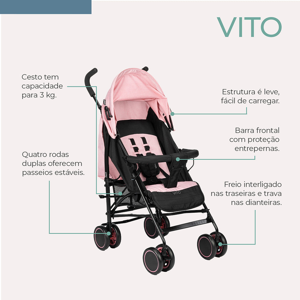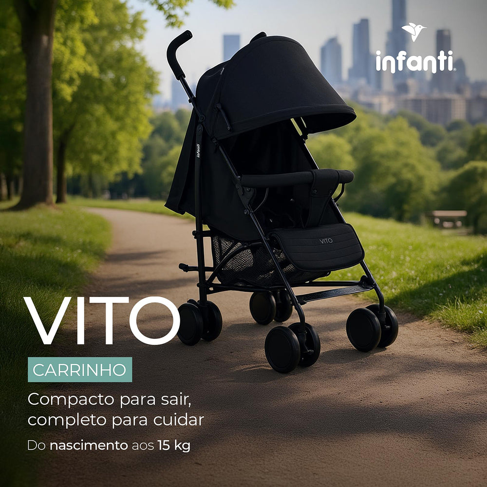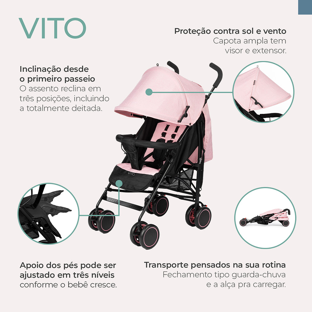 Desde os primeiros passeios, o Carrinho Vito está pronto para acompanhar você e seu bebê com cuidado e conforto. Indicado desde o nascimento até 15 kg, tem assento com 3 posições de inclinação, incluindo a posição berço, pensada especialmente para os recém-nascidos.