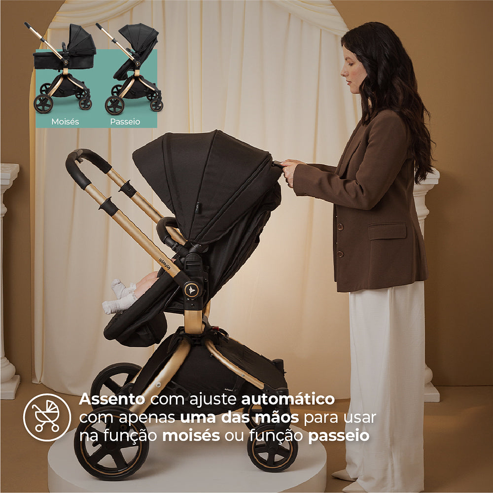 Assento do carrinho com ajuste automático e prático com apenas uma das mãos para usar na função moisés ideal para os recém-nascidos ou função passeio para o bebê que já consegue sentar