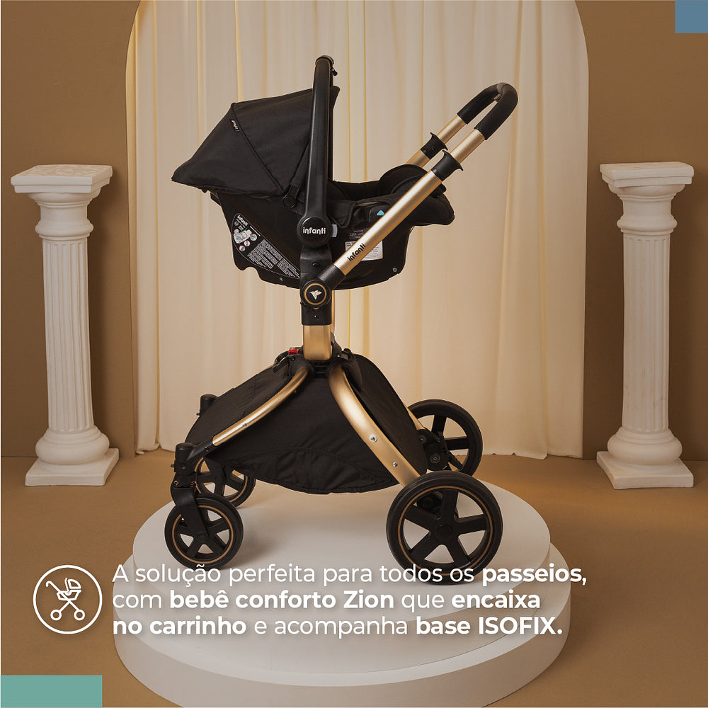 O conjunto perfeito: Carrinho inovador com giro 360°, bebê conforto Zion e base com instalação Isofix, que proporcionam praticidade e conforto incomparáveis.