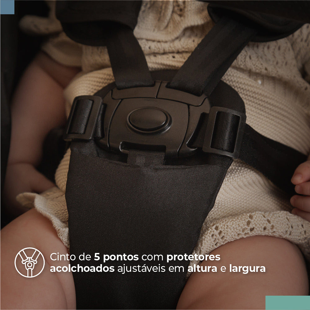 Cinto de 5 pontos para o carrinho e cinto de 3 pontos para o bebê conforto, ambos com protetores acolchoados e ajustáveis em altura ou largura