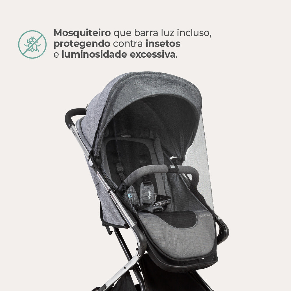 A capota com proteção UV50+ é bem ampla, com quebra-sol e visor com fechamento em imã. Confeccionada em tecido esportivo, que não amassa e é macio ao toque, a capota possui um bolso com zíper para pequenos objetos, com capacidade para 2 kg. Além disso, conta com uma extensa abertura traseira com zíper e tela, permitindo visualizar facilmente todo o interior do carrinho e deixá-lo mais arejado para o bebê quando necessário. Inclui mosquiteiro para proteção contra insetos e luminosidade excessiva, aperfeiçoando o conforto, inclusive para o soninho.