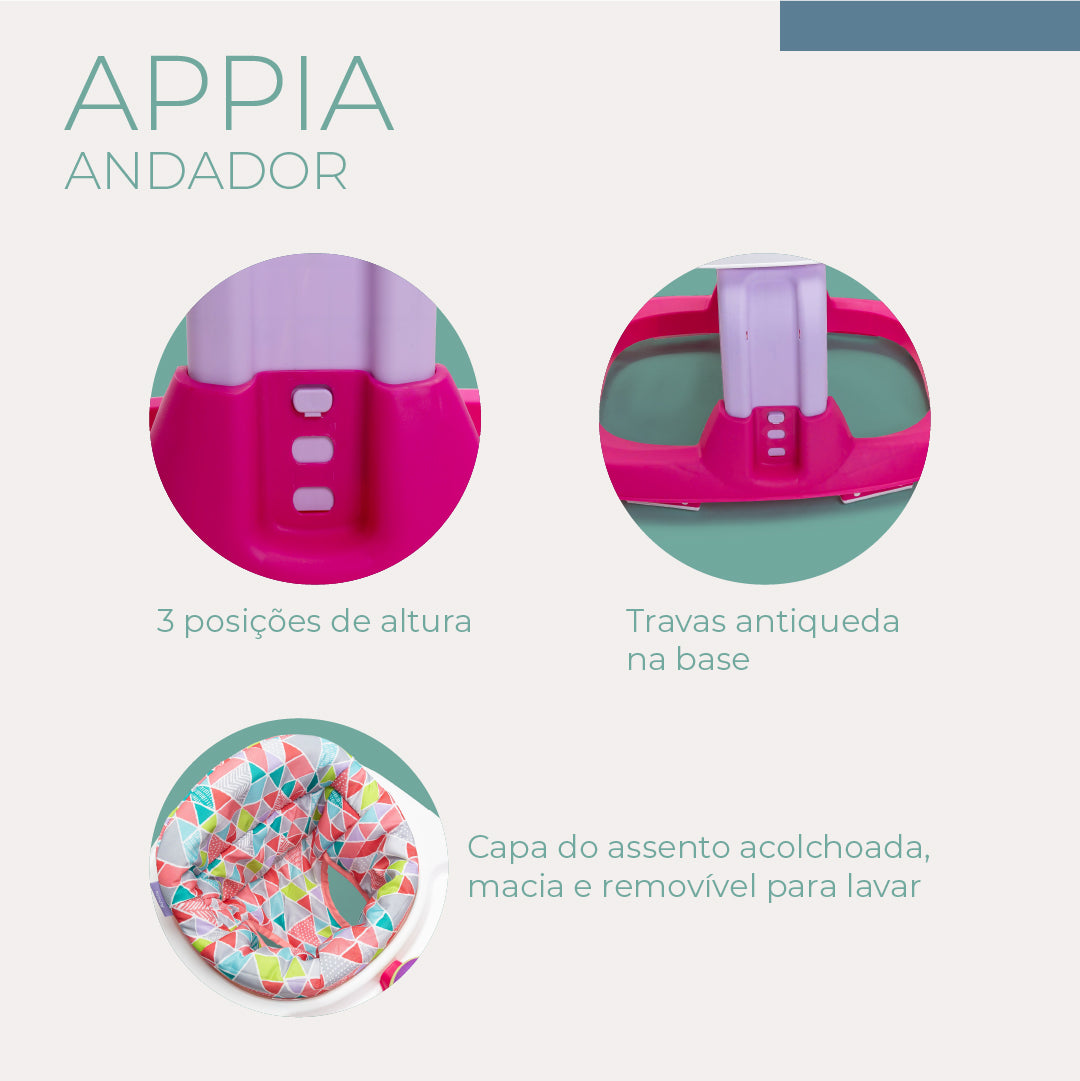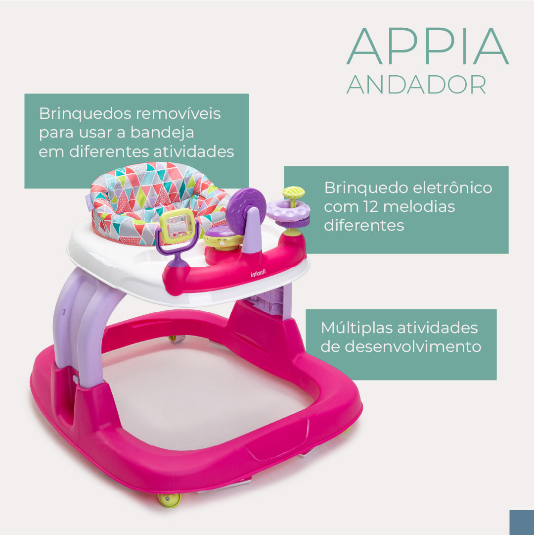 Quando os bebês vão descobrindo o mundo ao redor deles, querem explorar cada vez mais! Para acompanhar essa fase com segurança e muita diversão, o andador Appia traz diversas atividades que estimulam o desenvolvimento deles.