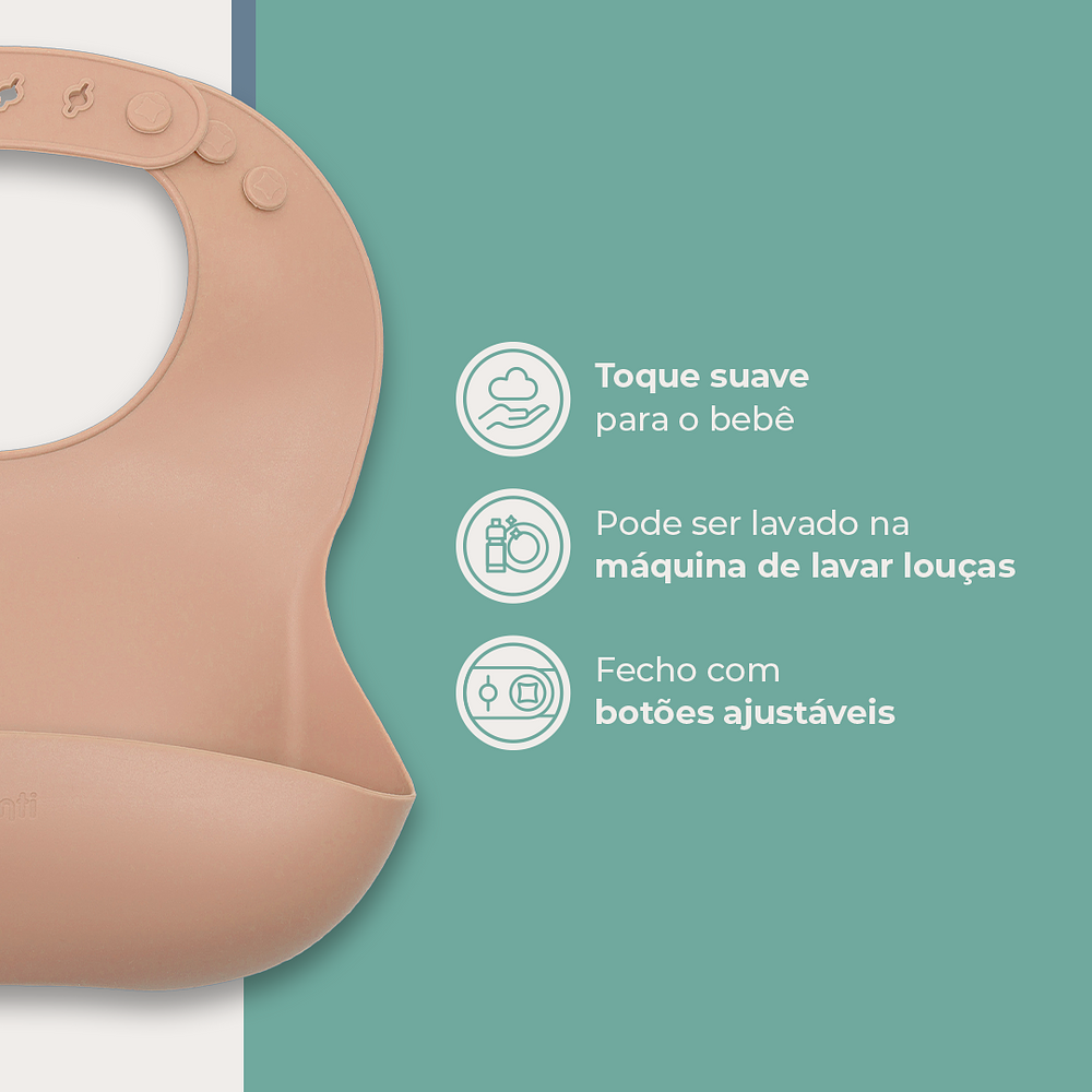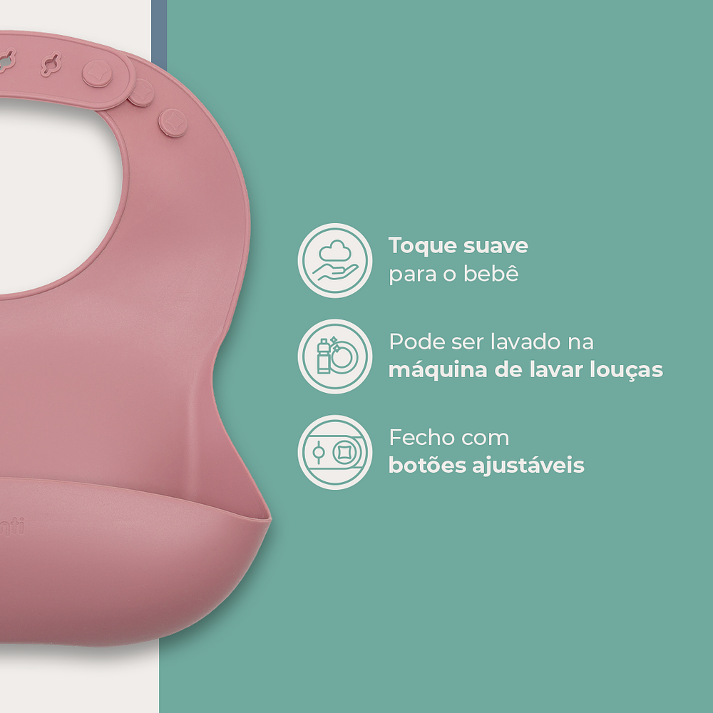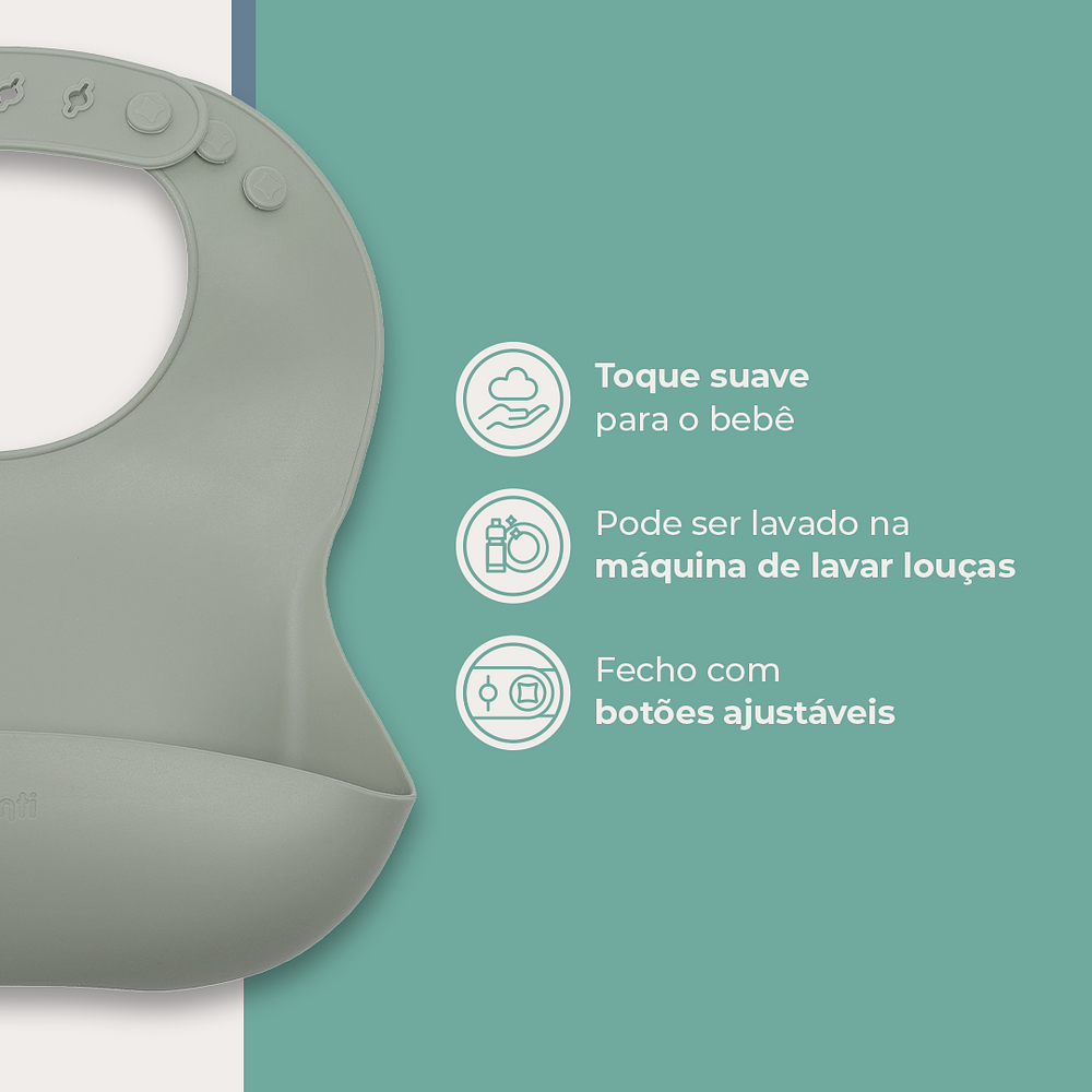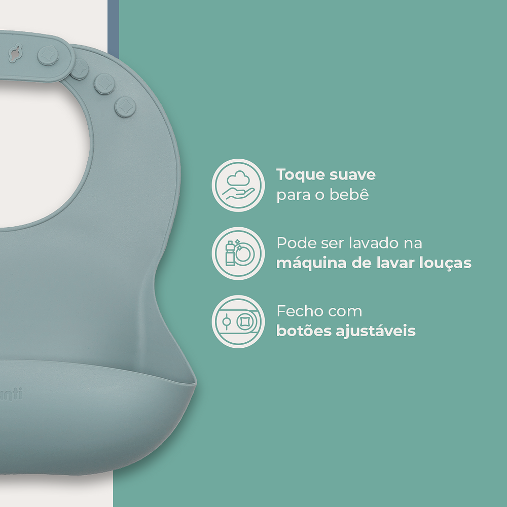 O Babador de Silicone com Pega-migalhas é projetado para uso por bebês a partir de 6 meses de idade e conta com 4 ajustes de tamanho na altura do pescoço. Ele ainda é super prático na hora da limpeza, podendo ser lavado na máquina de lavar louças.