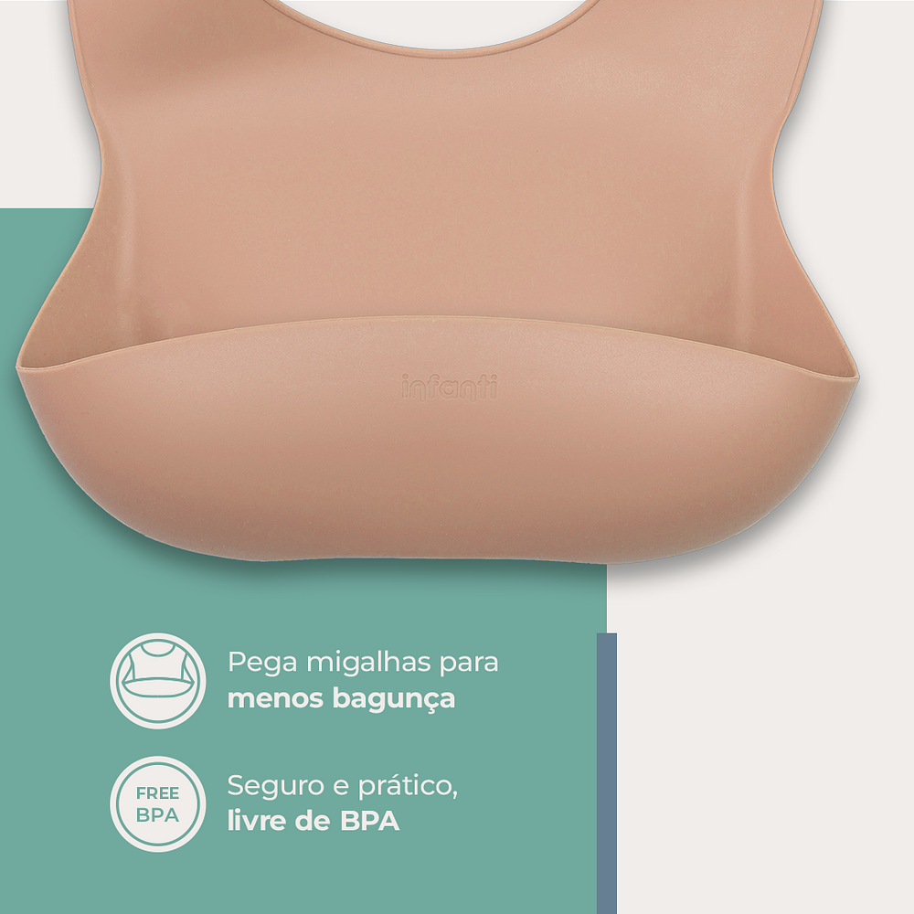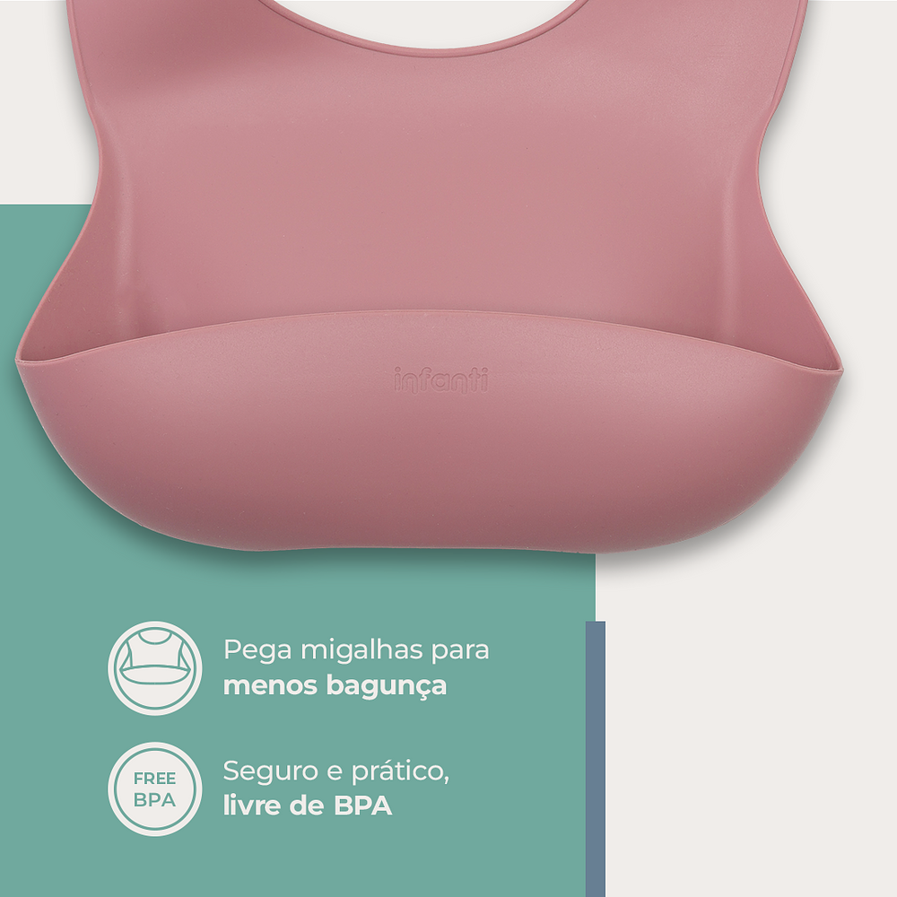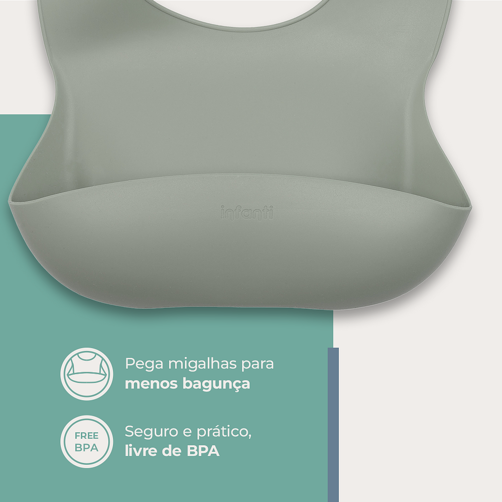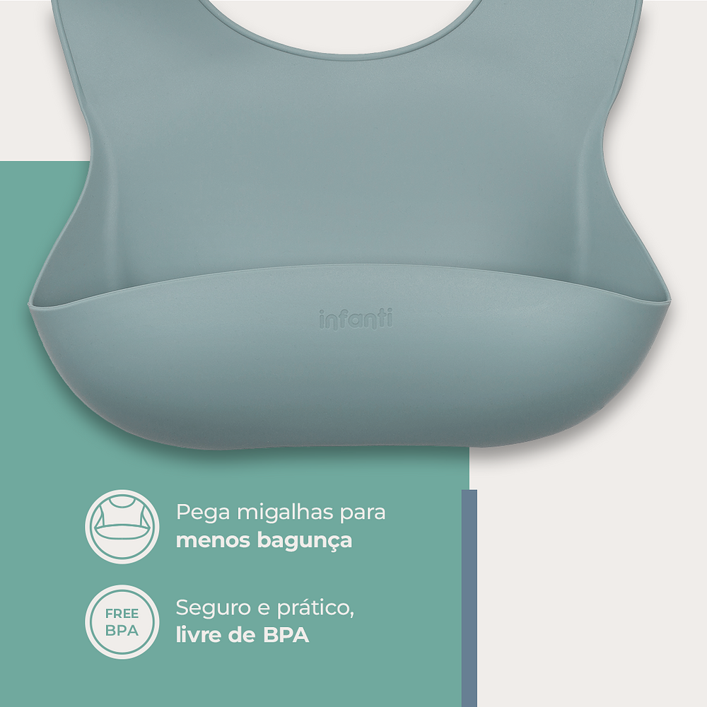 A fase da introdução alimentar é uma época de muito aprendizado em busca da autonomia da criança. E nesse caminho, uma certeza que os pais podem ter é que vai haver sujeira! Mas isso não precisa ser motivo de preocupação: o Babador de Silicone com Pega-migalhas vai proteger a roupinha do bebê tanto na região do peito quanto na altura da barriga e nas pernas, já que tem o pega-migalhas vai evitar que os alimentos caiam em cima da criança!