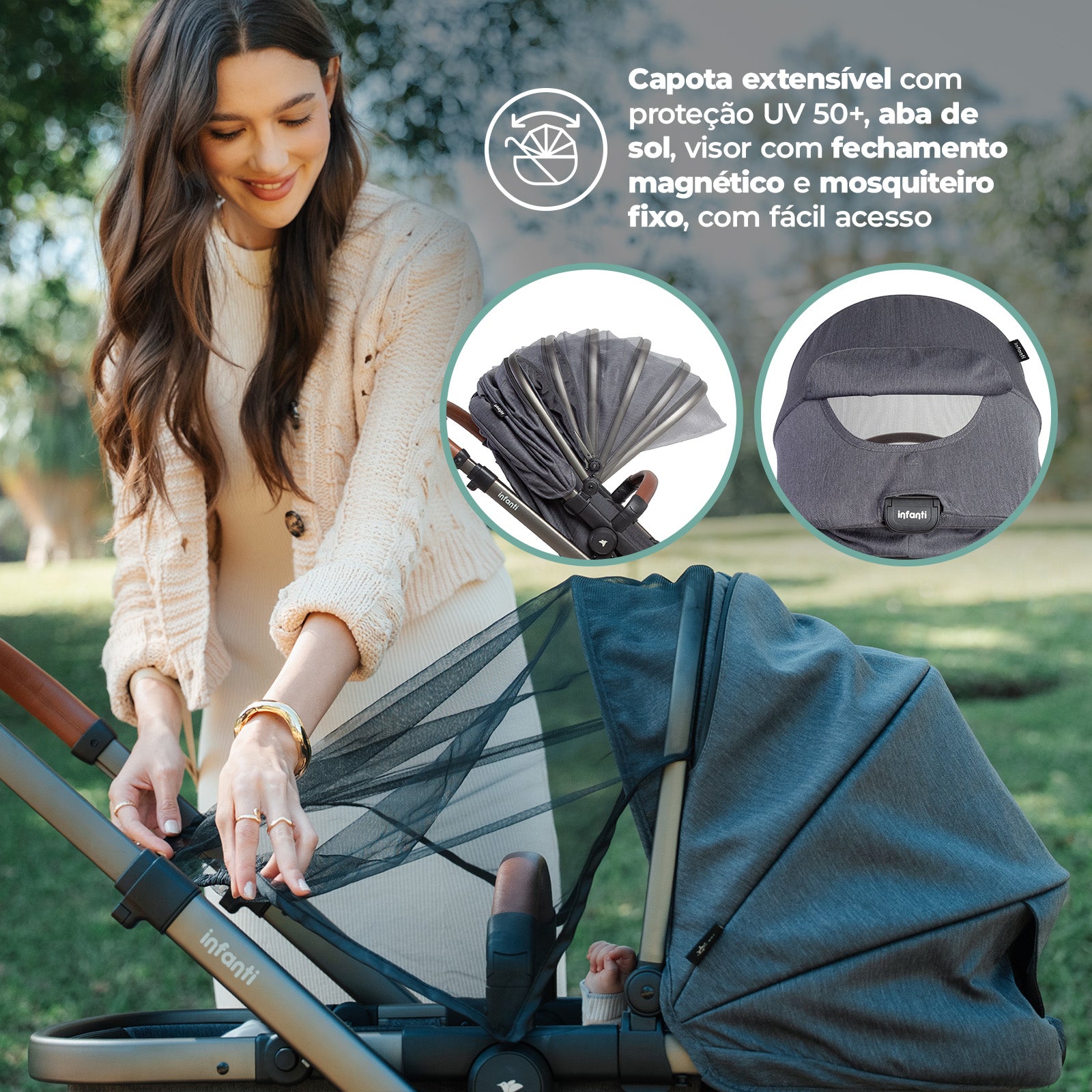 | Capota | Ampla com aba de sol, FPS UV50+, visor magnético e mosquiteiro acoplado |